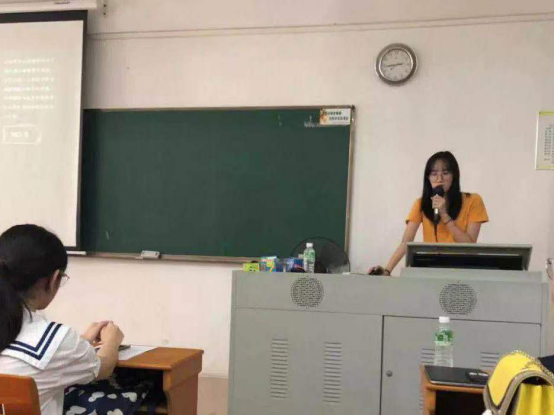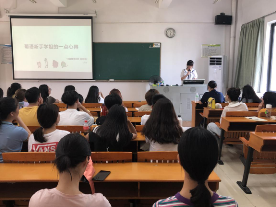 为了向新生树立一个好的学习榜样,葡语专业的老师们请来了18级优秀学生代表杨司颖同学来给新生分享学习经验。她用幽默风趣的话语让原本有些严肃的介绍会氛围变得轻松起来。杨司颖同学在今年6月份参加了中山大学主办的华南地区第一届葡语演讲比赛并获得了全场第四名的好成绩。她坦言自己在一年多的葡语学习中,并没有做什么特别的事,只是付出了更多课外的时间加强巩固葡语的学习。对于老员工活,杨司颖同学表示,无论是学习还是参加社团,或是自己学习别的东西,都是宝贵的财富,不要白白浪费了这四年的光阴。