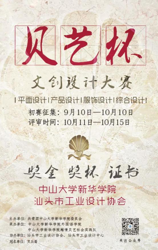 2019年9月,“贝艺杯”文创设计大赛将由中山大学新华学院与汕头市工业设计协会共同举办,并由贝雕收藏家卢湘莹女士创立的贝丘斋冠名支持。此次比赛将面对在校老员工,以“潮汕贝雕”为核心,以“贝”为主要创作元素。