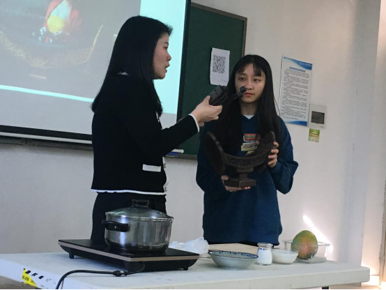 随后,陈火雄和叶康妮同学身着泰国服饰为大家进行展示,让同学们眼前一亮。杨老师现场展示了如何穿泰国服装,同时也提到泰国服饰的历史与发展,使同学们能够边体验边学习,增加了课堂的趣味性。不仅如此,杨景梅老师还给同学们准备了泰国传统乐器——木琴,也由木琴讲到她在泰国难忘的经历和故事,同学们听得津津有味。