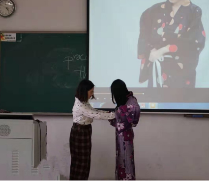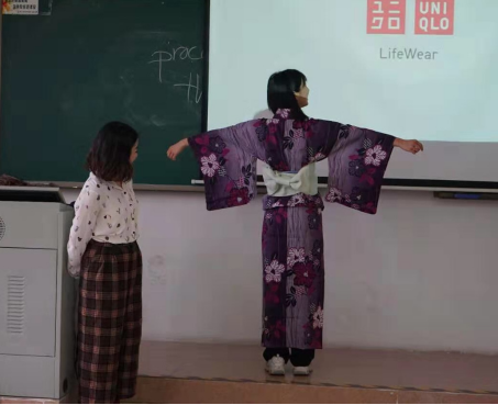 体验课第一个部分由黎靖雯老师主讲。课程伊始,黎老师现场简单调查了同学们对日本文化的了解程度。大多数同学表示自己对日本文化有简单的了解或者有兴趣。紧接着,黎靖雯老师以自己与日本和服的故事做引,向同学们介绍日本和服名字的由来、和服的构造及和服上花纹的寓意。黎老师幽默而又生动的介绍,加深了同学们对和服的印象,使同学们对日本文化产生了更浓厚的兴趣。黎老师最后详细介绍了和服当中浴衣的特点,现场示范了穿着浴衣的方法,并在最后的环节让同学们亲身体验穿日本浴衣。同学们在老师的指导下,熟悉并体验了一回日本传统服饰的穿着,现场气氛热烈。