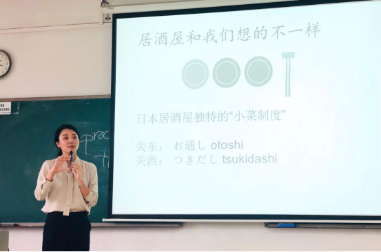 课程第二个部分由叶雅文老师主讲日本的饮食文化。首先,叶雅文老师向同学们介绍了日本关于酒的文化。她说道:在日本,酒瓶放置的位置和倒酒的方式都很有讲究。随后,叶雅文老师向同学们介绍了去日本餐厅时应该注意的事项以及餐桌上的礼仪。比如在日本,点菜一般先点饮料,后点菜;用筷子插食物,用筷子接他人夹的菜,在碗里面挑菜等都被视为不雅行为等。最后,叶老师还列举了许多日本文化小知识故事,同学们都表示收获满满。