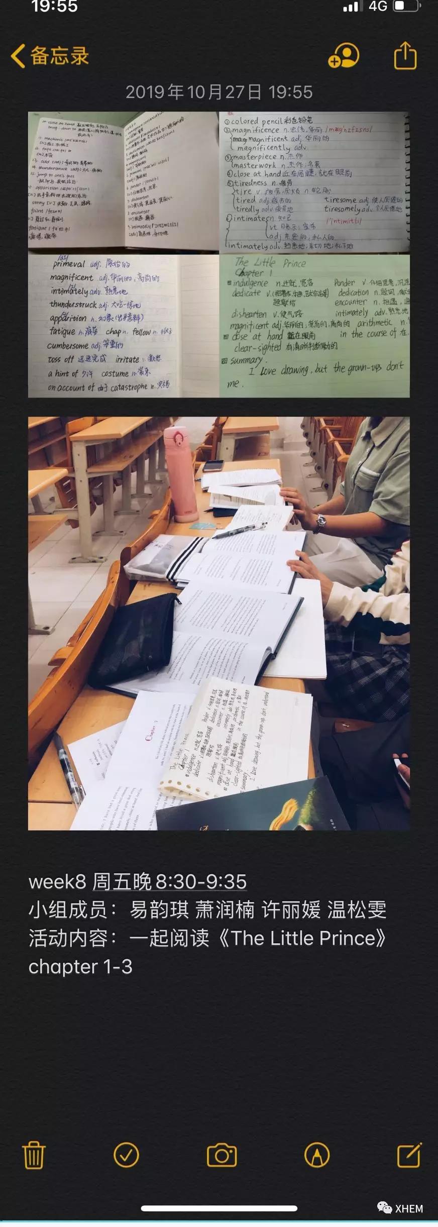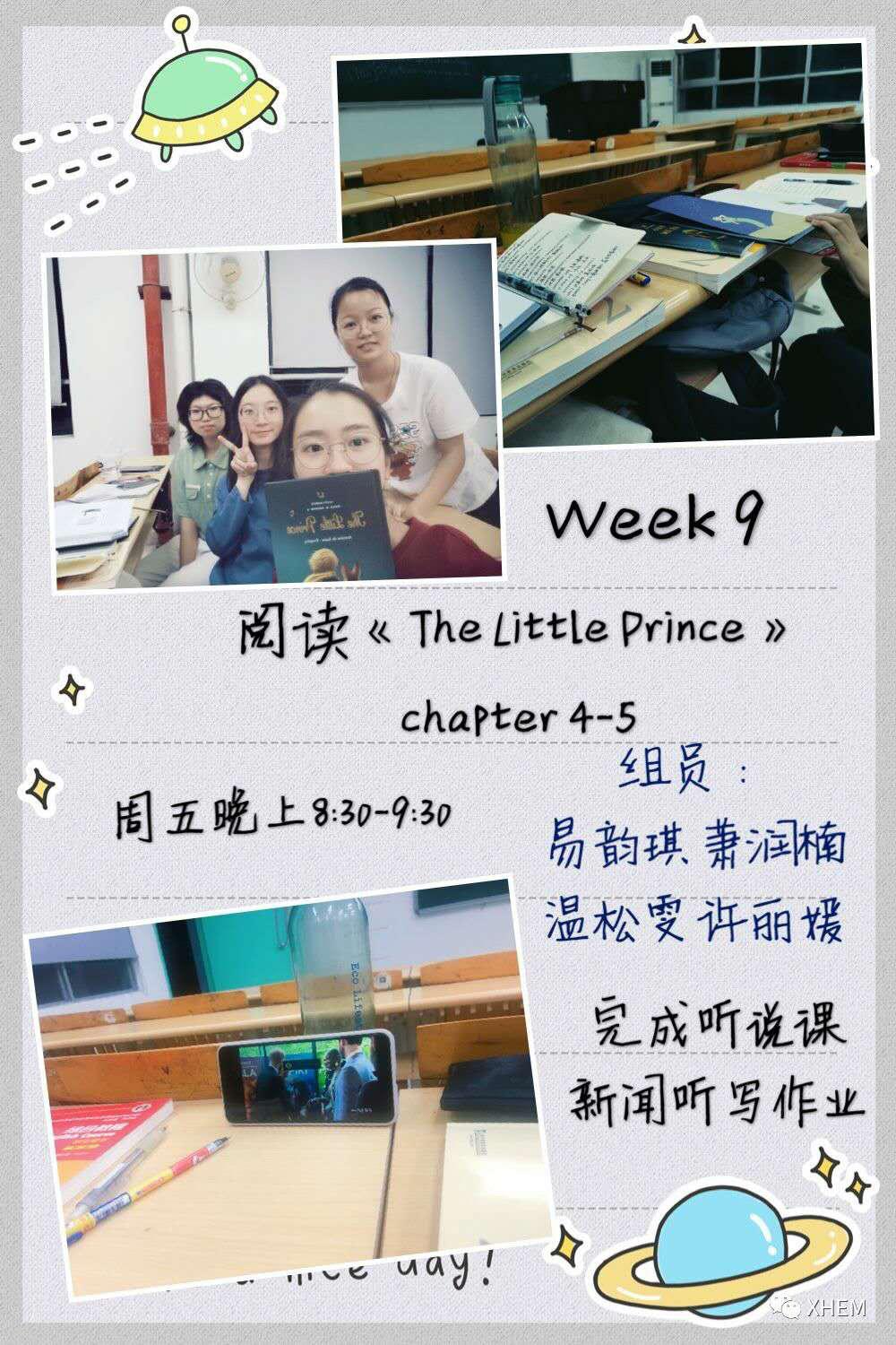这学期我们四个人一起看了《小王子》的原版书还有英文电影《大侦探皮卡丘》,大家从一开始的陌生到现在的熟悉,还一起完成了一份超棒的口语课presentation,有了这段小组每周一起学习和生活的时光,我们相聚的夜晚也变得更加美好啦!引用课外小组阅读的《小王子》里的一句话,"It is the time you have wasted for your rose that makes your rose so important."——期待两年之后的我们也会收获那朵属于自己的独一无二的玫瑰花。