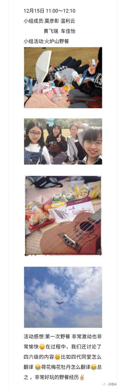每一个人都很忙但每周的小组活动小伙伴都兴致勃勃的商量要搞什么活动,我们一起去爬山(结合课本上大自然的主题)、去东莞校区观看全国演讲比赛(为以后我们的参赛做准备)、一起吃饭喝糖水,我们一起闹、一起笑,最好的友谊莫过如此,与吾相遇在卓越5班,何其有幸!