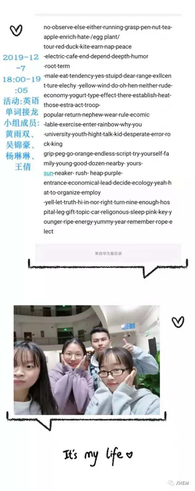 “要讲英语喔~”“Speak English,please”这是我们小组潜移默化就留下来的口头禅,用来互相提醒,在课外的小组学习中,也要谨记全英交流。我们四个人一开始因缘而聚,从陌生到相处融洽的默契,一起完成小组作业,一起去喝糖水,一起写作业,一起自习。我们四个人的友谊真的很棒,下个学期,下下个学期,下下下个学期,我们都要继续一起努力,一起冲冲冲!