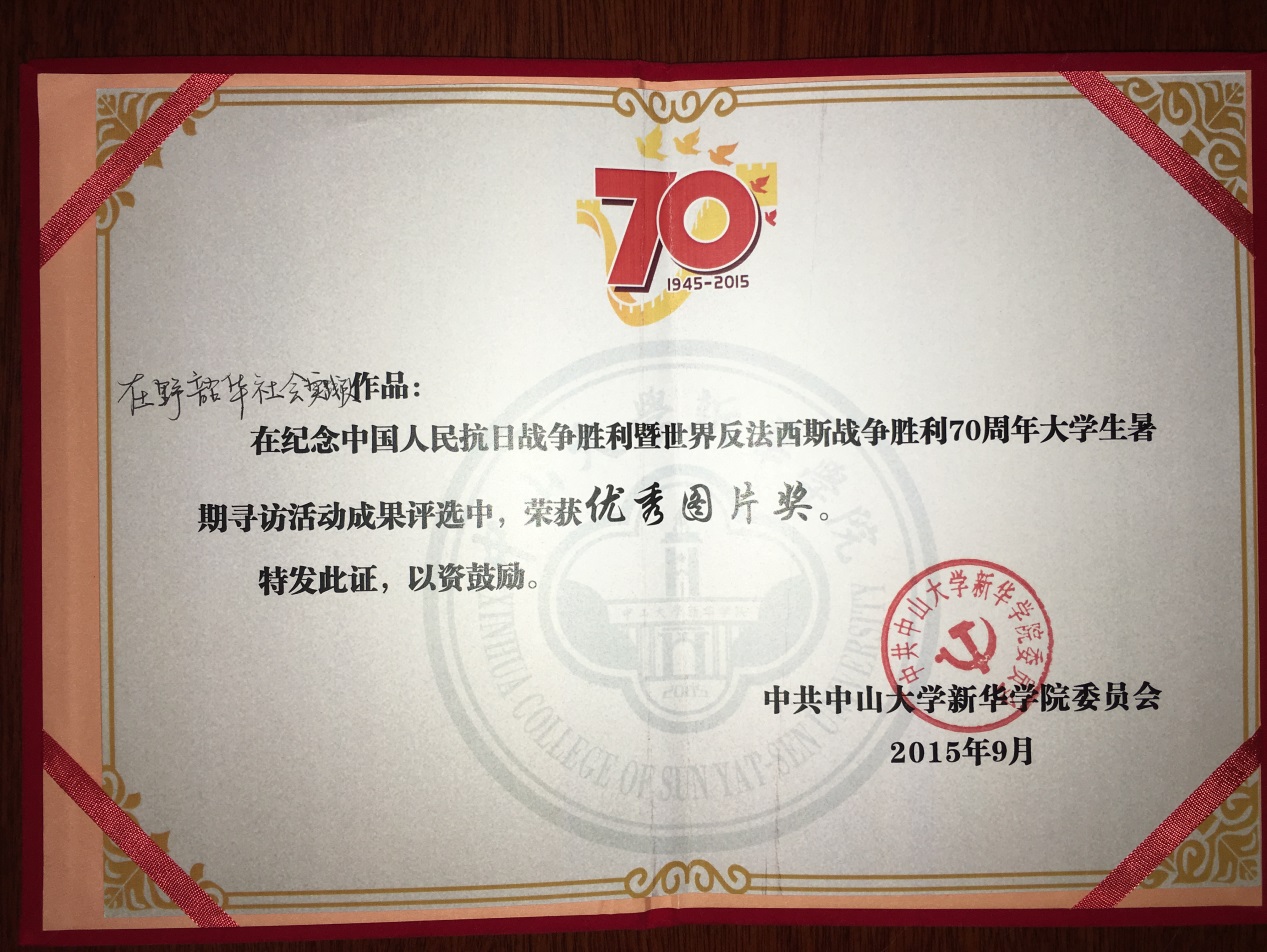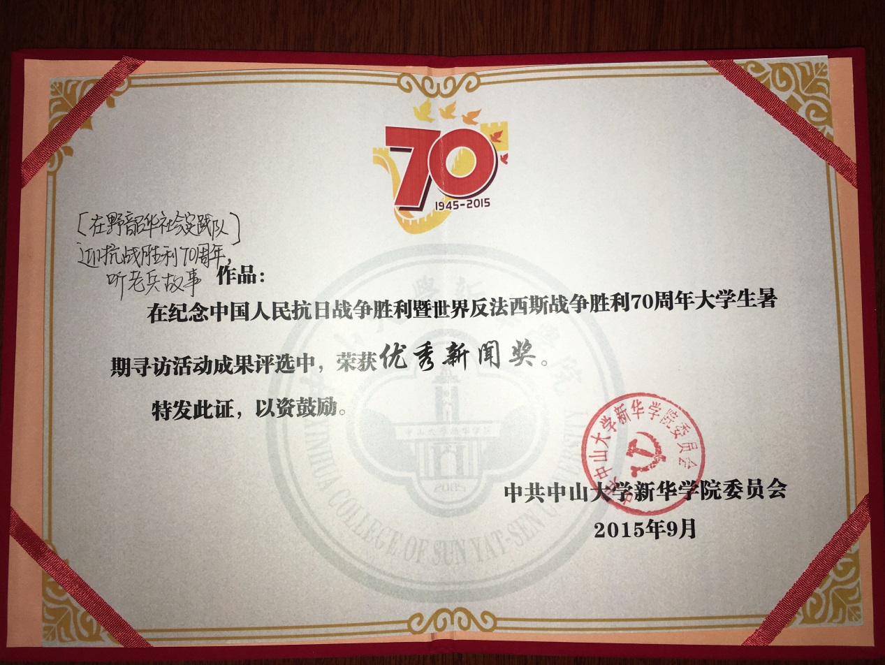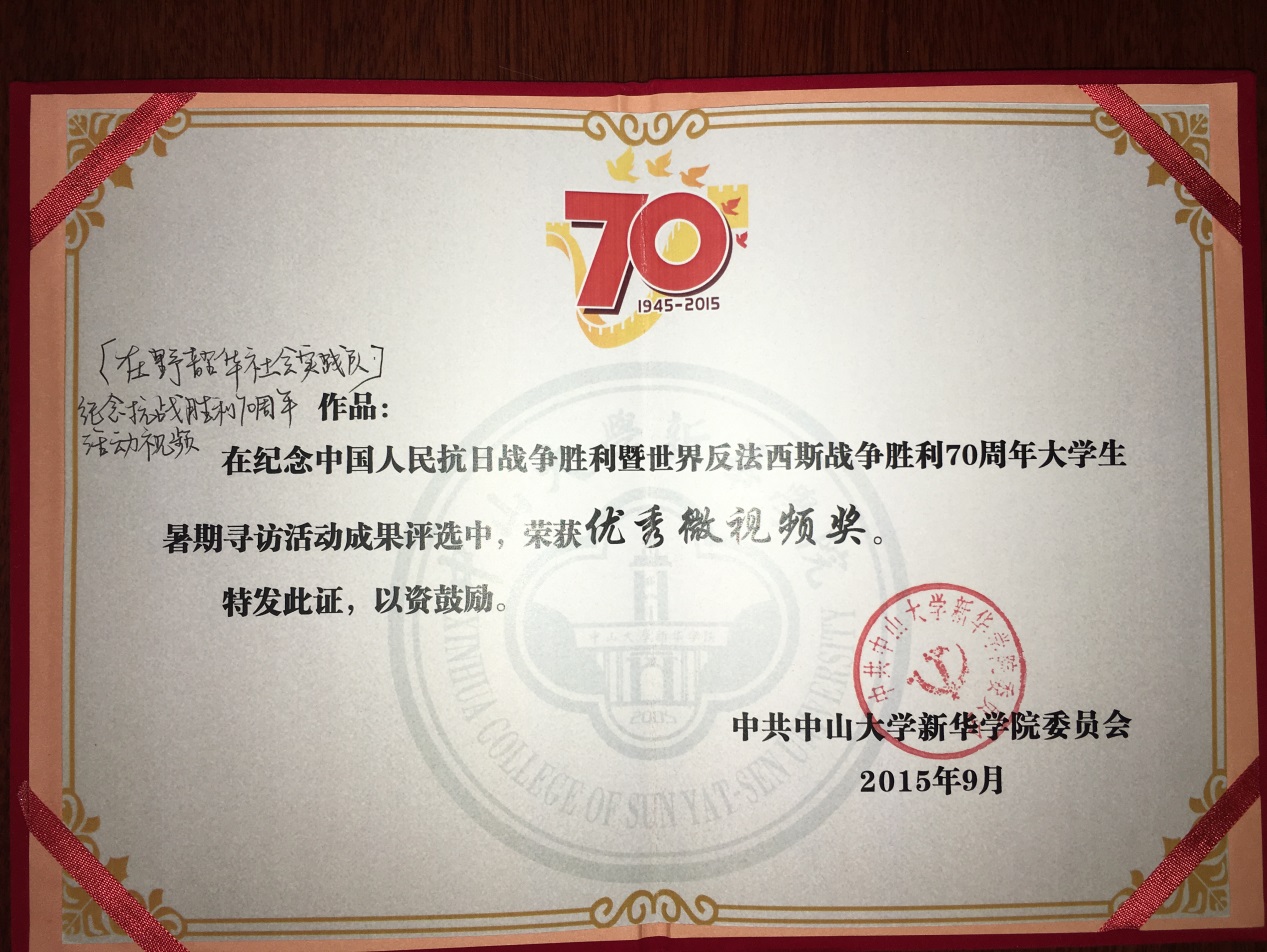 在此次活动中,外国语言文学系 “在野韶华”团队也在公司纪念抗战胜利70周年活动中共荣获“优秀微视频奖”、“优秀新闻奖”、“优秀图片奖”三个奖项。