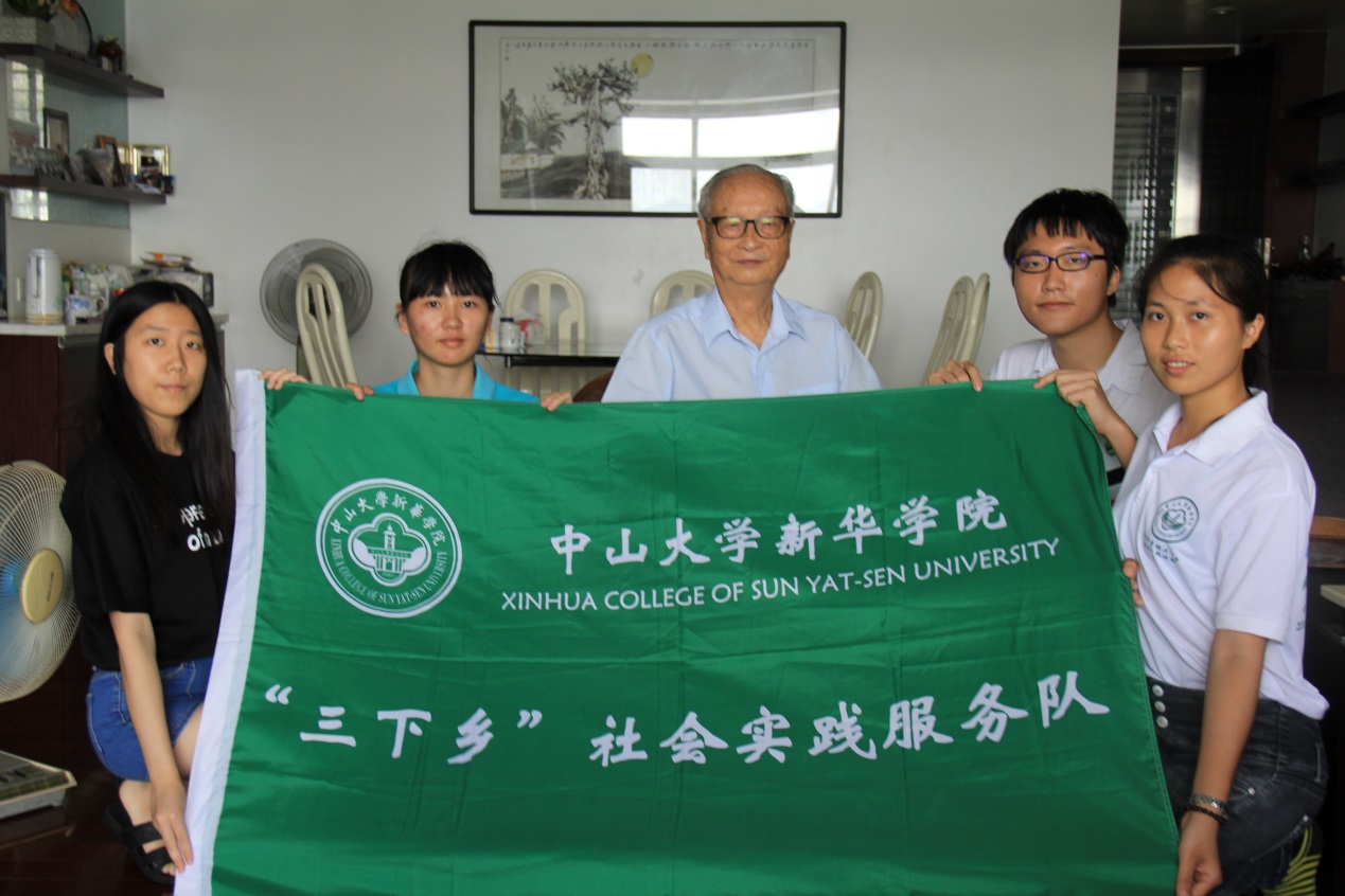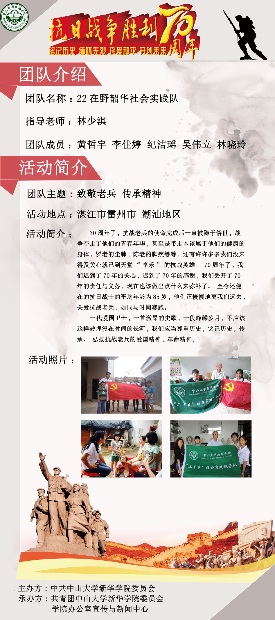2015年暑期,在外国语言文学系副主任黄继炎老师,办公室副主任林少淇老师的带领下,“在野韶华”社会实践团队一行8人在潮汕关爱老兵志愿队的大力支持下,我们探访了重庆军令部第二厅四处上尉连长罗春晖同志、青年军战士陈文喜同志、陈纳德飞虎队的翻译员叶继纲同志、苏北挺进军战士郭予广同志、新一军30师直属工兵营第一连工兵林卓群同志、空军马文超同志,并对此次活动进行了文字、图片、视频等多种素材的记录,力求将老兵的寄语与生活状态真实记录下来,分享给更多人知道,用实际行动去关爱老兵,让老兵们能更好地享受他们为之奋斗的幸福生活。