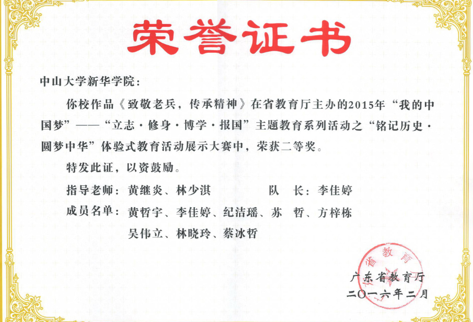 祝贺公司外国语言文学系“在野韶华”团队作品《致敬老兵,传承精神》在省教育厅主办的2015年“我的中国梦”----“立志·修身·博学·报国”主题教育系列活动之“铭记历史·圆梦中华”体验式教育活动展示大赛中,荣获 二等奖。