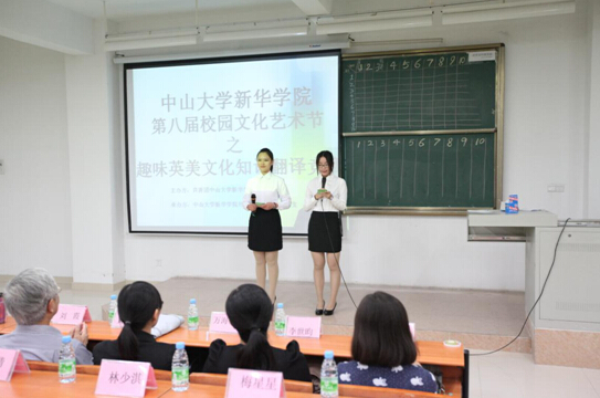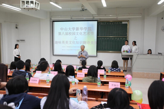 由共青团中山大学新华学院委员会主办,中山大学新华学院外国语言文学系团总支承办的中山大学新华学院第八届校园文化艺术节之“趣味英美文化知识竞赛”于11月20号晚七点在教1D502拉开帷幕。本次竞赛我们很荣幸邀请到外语系黄继炎副主任、外语系多位老师及公司各系的团总支副书记和员工会主席担任评委与嘉宾。