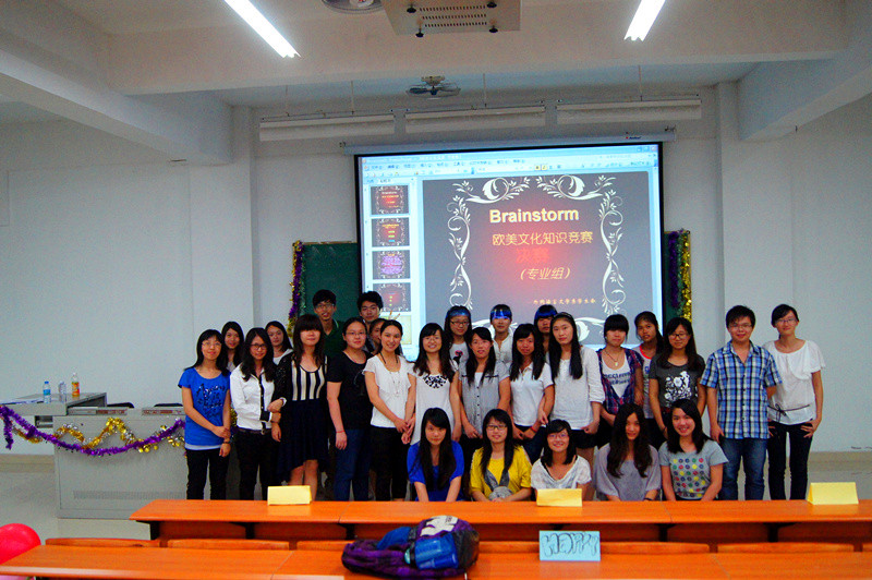 本次竞赛分初赛和决赛两场,来自全院共12个代表队进入决赛。决赛分必答题、抢答题和猜答题三个环节。两位主持人轻松幽默的主持风格使得比赛现场气氛活跃,赛程安排井然有序。选手们准备充分,在必答题环节各自都展示出对欧美文化知识丰富的积累;而在紧张刺激的抢答环节中,选手们所表现出的沉着冷静更是让现场观众称赞不已;最后,图片猜答环节各组选手绞尽脑汁、四肢并用,搞笑夸张的表演将整场比赛的气氛推向了高潮。历经两小时的激烈角逐,最终11级英语专业H班代表队成功夺得桂冠。特邀嘉宾为获奖代表队颁发奖状、奖品,合照留念。