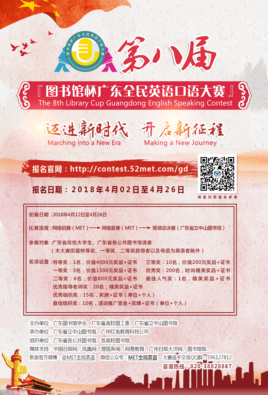 为迎接“4.23世界读书日”,倡导并组织开展阅读推广工作,不断创新方式推广阅读,加强阅读推广宣传服务;更好地致力于图书馆文化建设,发挥图书馆学习基地的功能;促进读者之间基于英语学习的交流和竞技,提高读者英语应用的能力。广东图书馆学会、广东省高校图工委、广东省立中山图书馆将于2018年3月至6月联合全省各图书馆共同举办第八届『图书馆杯广东全民英语口语大赛』。