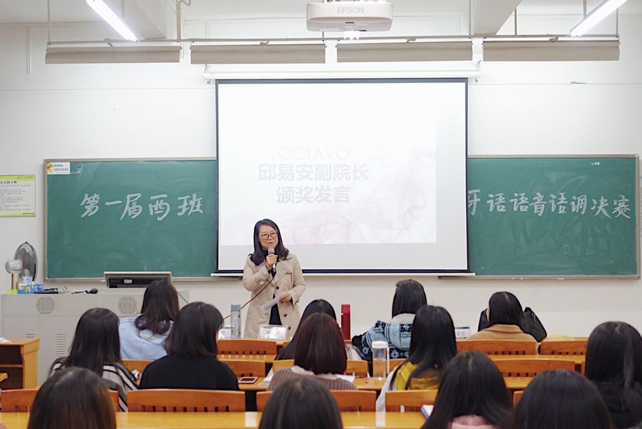 在紧张激烈的角逐后,比赛共评选出一等奖一名,二等奖两名,三等奖三名,优秀奖四名。随后邱易安教授为获奖选手颁奖并发言。首先,她肯定了西班牙语员工的努力并表扬了2016级、2017级西班牙语员工。邱易安教授指出,2018级西班牙语专业的员工应要师兄师姐学习,把他们作为学习的标杆、努力的榜样。最后,她希望同学们不断努力,西语学习一届更比一届强。