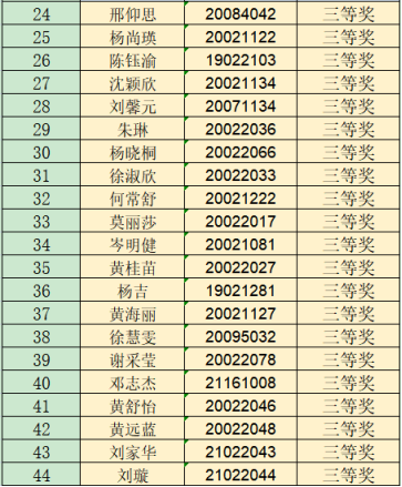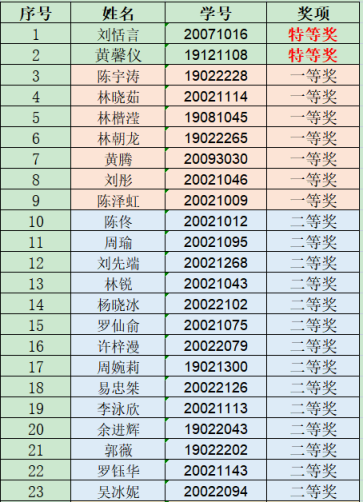 根据比赛分数排名,共有44名同学获得校级奖项(不含进入省级决赛的选手),其中特等奖2名,一等奖7名,二等奖14名,三等奖21名,具体名单如下: