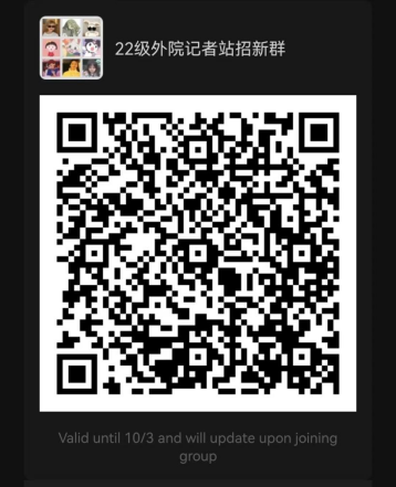 22级的新生们!欢迎加入外院记者站哦!!作为一名小记者,你将可以在这里学习到许多相关技能!还可以近距离观看各种大型活动!心动不如行动,快加入我们吧!