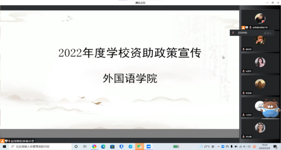 2022年5月24日晚上,太阳成集团tyc员工资助政策宣传会在腾讯会议顺利召开。参加本次会议的有党总支副书记欧衍伽老师、国家奖学金获得者18级英语专业莫小莹、国家励志奖学金获得者19级英语专业廖月怡以及外院全体同学,会议由辅导员赵雪敏老师主持。