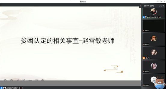 最后,赵雪敏老师介绍了贫困认定的相关流程,包括前期材料的准备、申请过程中诚实填报以及填写后注意留意小程序的提醒。并提醒获得国家助学金的同学要树立理性的消费观、提高诚信和感恩意识,认真学习,全面发展。