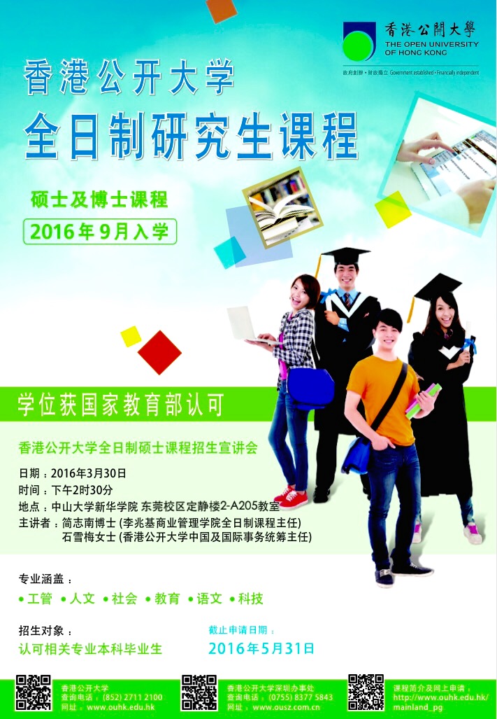 近日,公司拟开展推荐毕业生赴香港公开大学读研的宣传工作。香港公开大学李兆基商业管理学院应邀来公司做全日制硕士招生宣讲会及答疑,相关硕士课程信息可浏览:http://www.ouhk.edu.hk。欢迎各系有意向赴港深造的员工踊跃参与。烦请各系大力支持,转发通知及组织员工参加宣讲会。