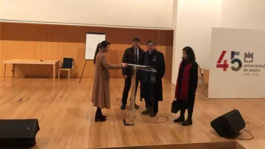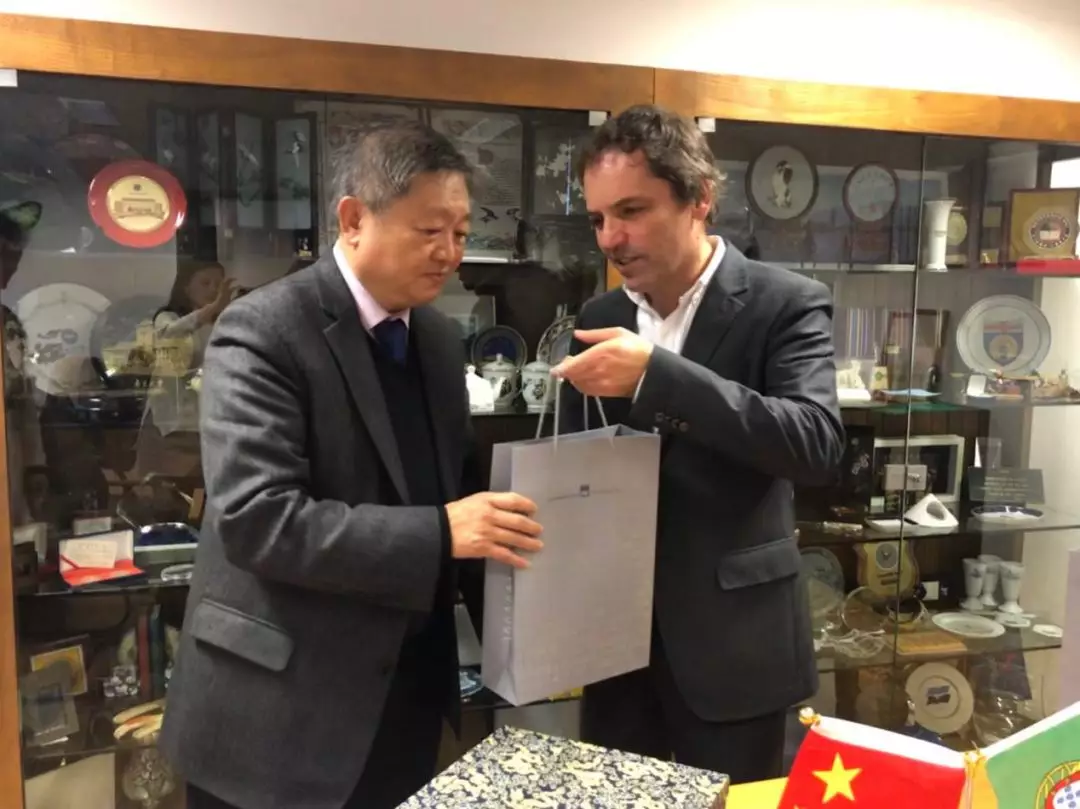 阿威罗大学董事长Paulo Jorge Ferreira教授对公司代表团的到来表示欢迎,王庭槐董事长代表公司致以衷心的感谢,双方董事长互赠纪念品并合影留念。