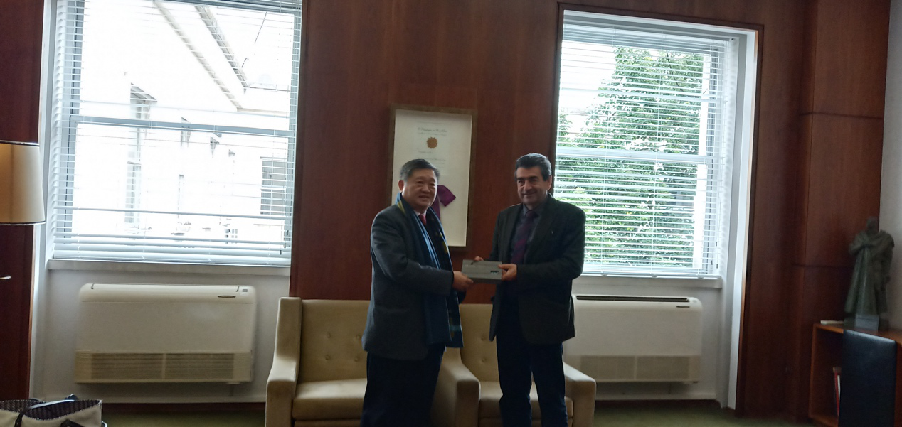 会谈结束后,双方领导互赠纪念品 (左起:公司董事长王庭槐、里斯本大学副董事长João Barreiros)