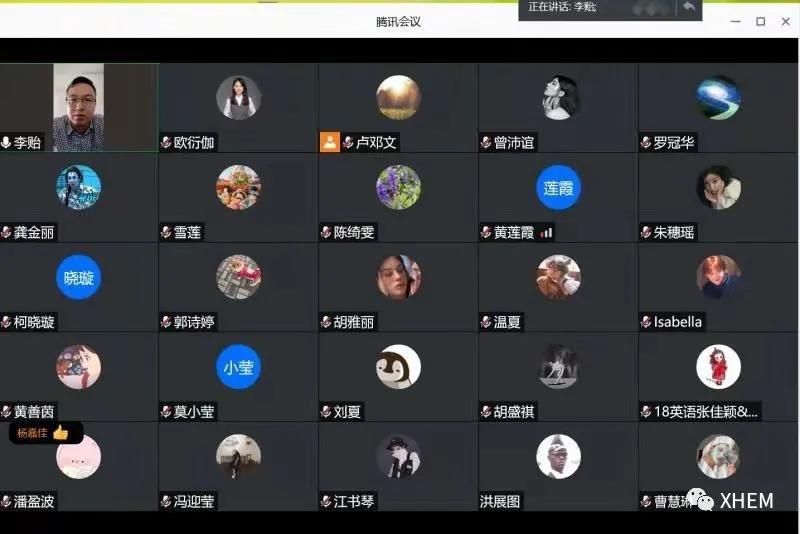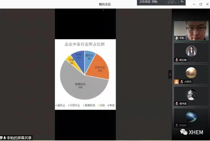 接着英语专业副主任李贻老师表示实习也是为了就业做准备,所以请同学们要重视实习。然后,李贻老师分享了英语专业毕业生毕业后去向的数据和图表,并分析了毕业生的就业意愿和实际的就业去向。从数据上来看,大部分的毕业生在企业就业,因此他建议同学们考虑到相应的单位去实习,积累工作经验。除了就业数据以外,李贻副主任还介绍了英语专业毕业生近年来考研的情况,鼓励同学们提前做好考研的准备,才能未雨绸缪。考研既可以考虑国内的学校,也可以考虑国外的学校,才能多手准备,有的放矢。最后,李贻副主任强调同学们一定要摆正心态。他以学校里抗疫中无私贡献的老师们的先进事迹鼓励同学们要刻苦耐劳,先不求所得和待遇而先去奉献。
