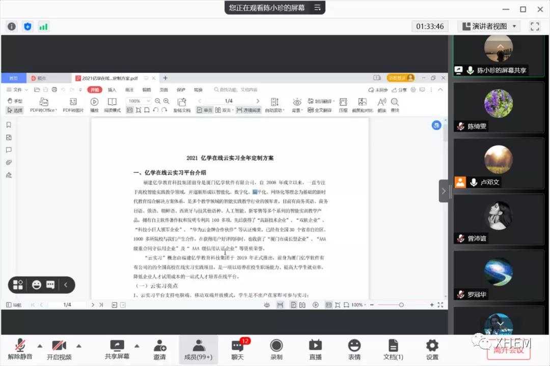 接下来,亿学教育科技集团代表陈小珍向参会的师生介绍了亿学在线云实习方案。陈女士指出亿学在线云实习提供的岗位包括英语教学产品研究院和国际贸易业务员。然后,陈女士详细解释了报名流程和平台操作事项以及考核评分方法等。