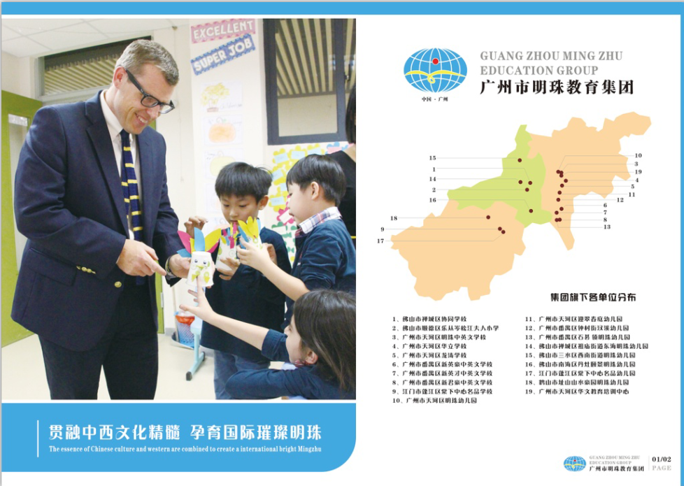 广州市明珠教育集团始创于2001年,是一家集幼儿园、小学、初中于一体的国际化民办教育机构,现有教职员工3000余人,在校员工50000多名。集团旗下有中小学9所,幼儿园9所,其中省一级学校1所,市一级学校4所。各校资源共享,优势互补,集团办学综合实力在广东省民办教育领域名列前茅。央视《共同关注》、《广州日报》、《南方都市报》、《新快报》、《中国教育报》、南方电视台等数家主流媒体报道了集团的办学与改革实践。