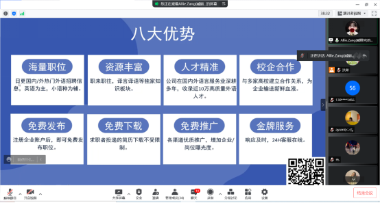 招聘会第三分会场由实践部主任洪茹老师主持,受邀企业为深圳市昆仲科技有限公司。昆仲科技的臧丽萍经理和陈嘉瑜经理分别向同学们介绍了昆仲科技旗下的外语岗位招聘平台——火星外语人才网。火星外语人才网集合了入驻平台的与外语专业相关的企业招聘信息,包括实习岗位和全职岗位。所有的入驻企业和招聘单位都均经过火星外语人才网筛选和认证,同学们可以根据自己的兴趣和能力,自由而有目的地投递简历。据陈经理反馈,公司一位19级商英学子从四月初至今在该平台完成了线上实习并成功拿到火星外语人才网的实习证明。昆仲科技欢迎各位求职的同学登录该网站了解就业市场,积极应聘心仪的职位。