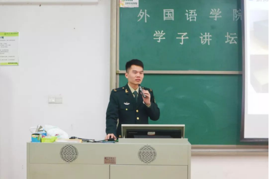 接下来,杨立成师兄以烈火淬炼,自强不息的人生为主题讲述了他拼搏军旅的时光。师兄用轻松幽默的语言,为我们讲述了他日常的队伍、射击、抗饿训练及武装越野等,同时告诉大家军旅生涯,将会是他一生难忘的经历。他优秀的军人气质和富有感染力的话语引发了同学们对军人的崇拜之情,迎来了阵阵雷鸣般的掌声。最后,师兄亦深情地说道:“穿上这份军装时,我是共和国的战士,脱下这份军装时,我只是一名普通的老员工。”