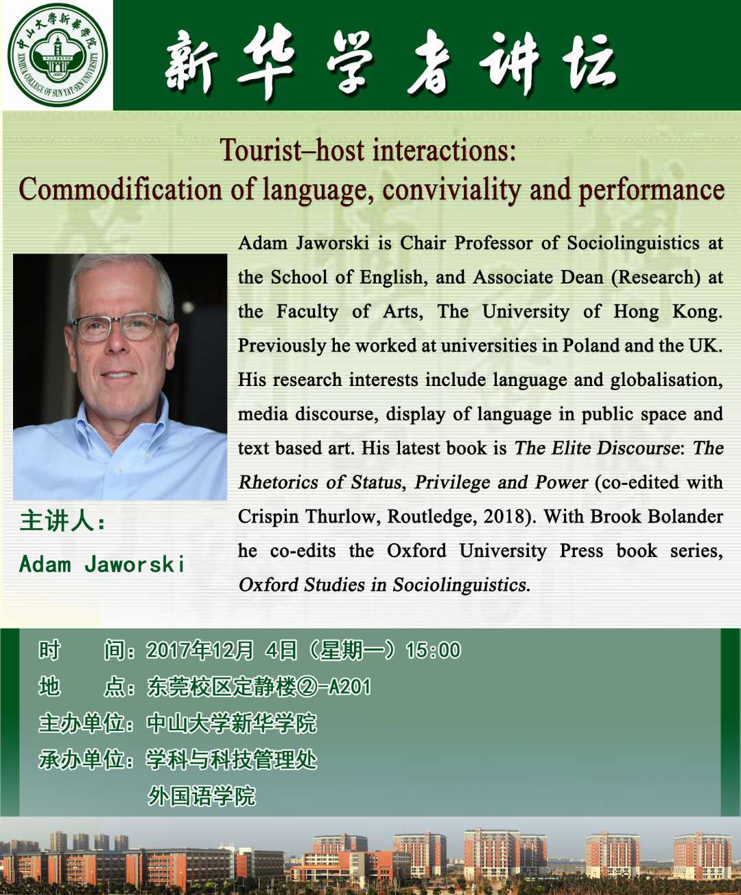 讲座题目:Tourist–Host interactions: Commodification of Language, Conviviality and Performance