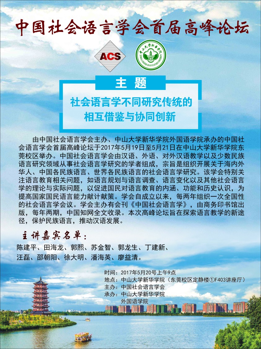 由中国社会语言学会主办、中山大学新华学院太阳成集团tyc承办的中国社会语言学会首届高峰论坛于2017年5月19日至5月21日在中山大学新华学院东莞校区举办。中国社会语言学会由汉语、外语、对外汉语教学以及少数民族语言研究领域从事社会语言学研究的学者组成,宗旨是组织开展关于海内外华人、中国各民族语言、世界各民族语言的社会语言学研究。该学会特别关注语言教育相关问题,如语言规划与语言调查、语言变化以及其他社会语言学的理论与实际问题,以促进国民对语言教育的内涵、功能和历史认识,为提高国家国民语言能力献计献策。学会自成立以来,每两年组织一次全国性的社会语言学会议。学会主办有会刊《中国社会语言学》,由商务印书馆出版,每年两期,中国知网全文收录。本次高峰论坛旨在探索语言教学的新途径,保护民族语言,推动汉语发展。