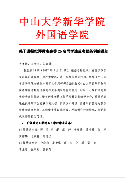 关于通报批评黄南森等26名同学违反考勤条例的通知