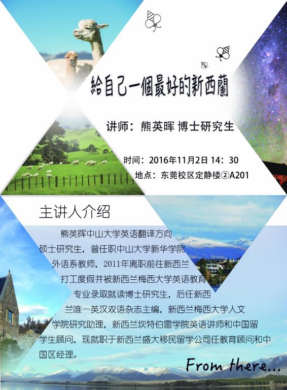 熊英晖 中山大学英语翻译方向硕士研究生,曾任职中山大学新华学院外语系教师,2011年离职前往新西兰打工度假并被新西兰梅西大学英语教育专业录取就读博士研究生,后任新西兰唯一英汉双语杂志主编,新西兰梅西大学人文学院研究助理,新西兰坎特伯雷学院英语讲师和中国职工顾问,现就职于新西兰盛大移民留学公司任教育顾问和中国区经理。