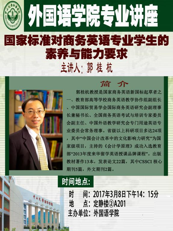 郭桂杭教授是国家商务英语新国标起草者之一、教育部高等学校商务英语教学协作组副组长、中国国际贸易学会国际商务英语研究会副理事长兼秘书长、全国商务英语考试与培训专家委员会副主任、中国外语教学研究会专门用途英语专业委员会常务理事。省级以上科研项目多达24项,其中“中国会计改革中的文化影响力研究”为国家级项目,主持的《会计学原理》成功入选教育部“2013年度来华留学英语授课品牌课程”。出版教材著作13本,发表论文22篇,其中CSSCI 核心期刊5篇,外文期刊2篇。