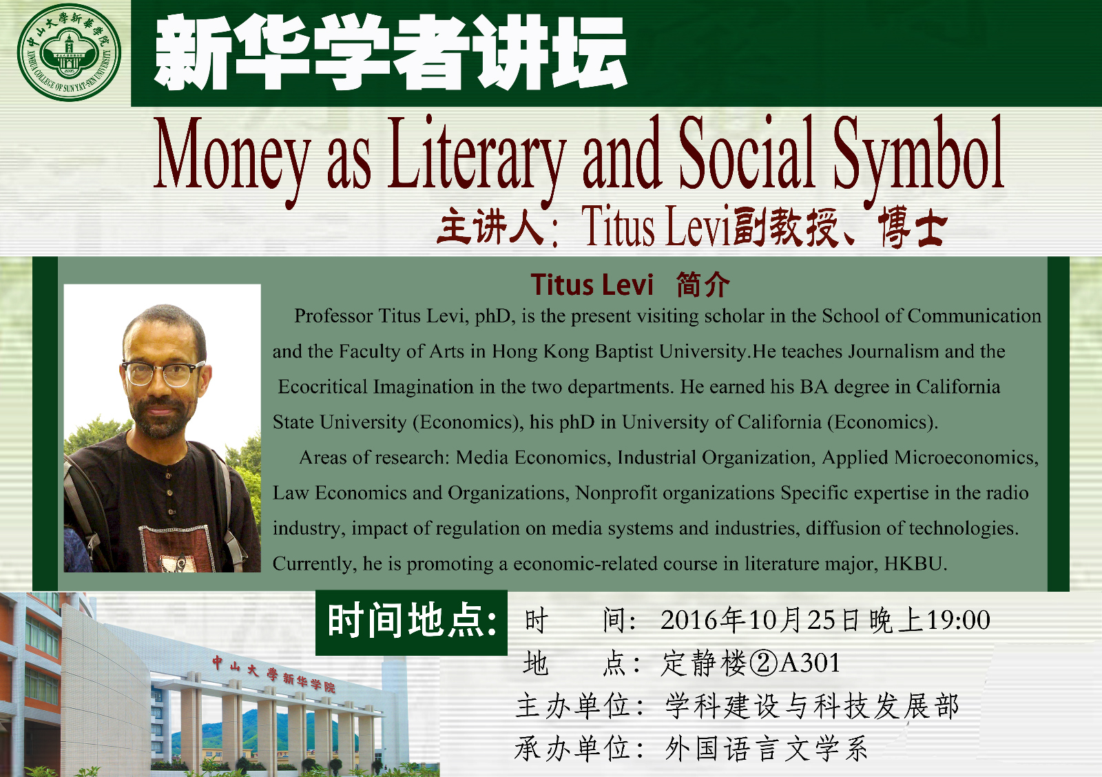主讲人:Titus Levi副教授、博士讲座主题:Money as Literary and Social Symbol面向对象:全院师生讲座时间:2016年10月25日晚上19:00讲座地点:东莞校区定静楼②A301主办单位:团队建设与科技发展部承办单位:外国语言文学系 主讲嘉宾简介 Professor Titus Levi, phD, is the present visiting scholar in the School of Communication and the Faculty of Arts in Hong Kong Baptist University. He teaches Journalism and the Ecocritical Imagination in the two departments. He earned his BA degree in California State University (Economics), his phD in University of California (Economics).Areas of research: Media Economics, Industrial Organization, Applied Microeconomics, Law Economics and Organizations, Nonprofit organizations Specific expertise in the radio industry, impact of regulation on media systems and industries, diffusion of technologies.Currently, he is promoting an economic-related course in literature major, HKBU. 讲座主要内容 Professor Titus 将用自己多年在经济学和文学双领域积累的经验,与我系英专和商英师生一起,共话跨学科领域学习和生存的潜在性和生命力,鼓励同学们在本专业知识学习过程中跳出固有思维,用不同的角度思考问题,为精彩的人生寻找不同的可能性。 外国语言文学系2016年10月24日