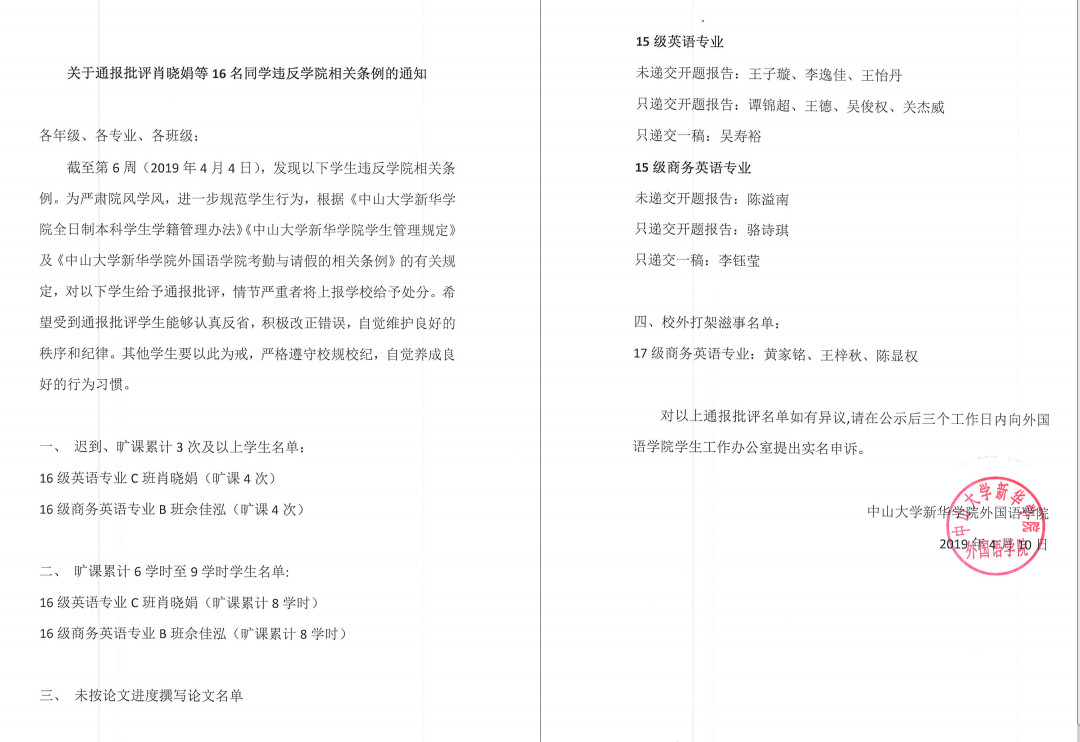 截至第6周(2019年4月4日),发现以下员工违反学院相关条例。为严肃院风学风,进一步规范员工行为,根据《中山大学新华学院全日制本科员工学籍管理办法》《中山大学新华学院员工管理规定》及《中山大学新华学院太阳成集团tyc考勤与请假的相关条例》的有关规定,对以下员工给予通报批评,情节严重者将上报学校给予处分。希望受到通报批评员工能够认真反省,积极改正错误,自觉维护良好的秩序和纪律。其他员工要以此为戒,严格遵守校规校纪,自觉养成良好的行为习惯。