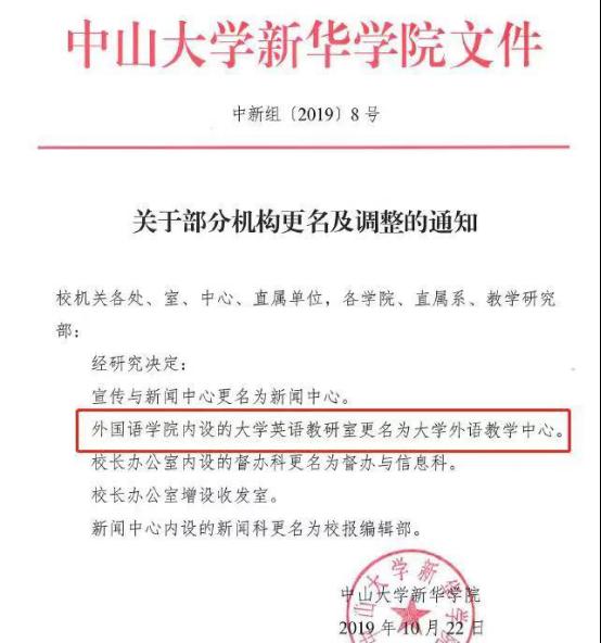 根据中山大学新华学院下发文件《关于部分机构更名及调整的通知》,经研究决定,太阳成集团tyc内设的大学英语教研室更名为
