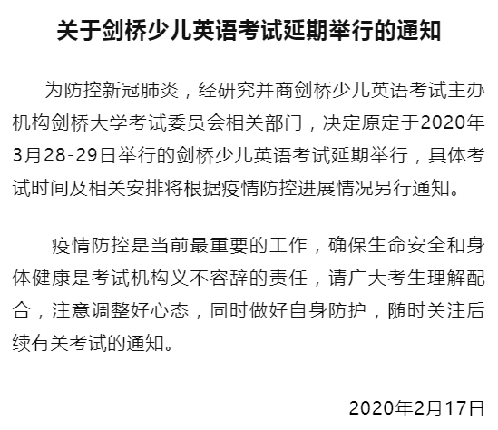 为贯彻落实国家和我省对新型冠状病毒感染的肺炎疫情防控有关工作的部署和要求,切实保障广大考生和考试工作人员生命安全和身体健康,经研究决定,推迟原定于3月7-8日举行的普通高考英语听说考试和本科插班生考试(含三二分段专升本转段考试)。具体时间安排视疫情控制情况另行通知。