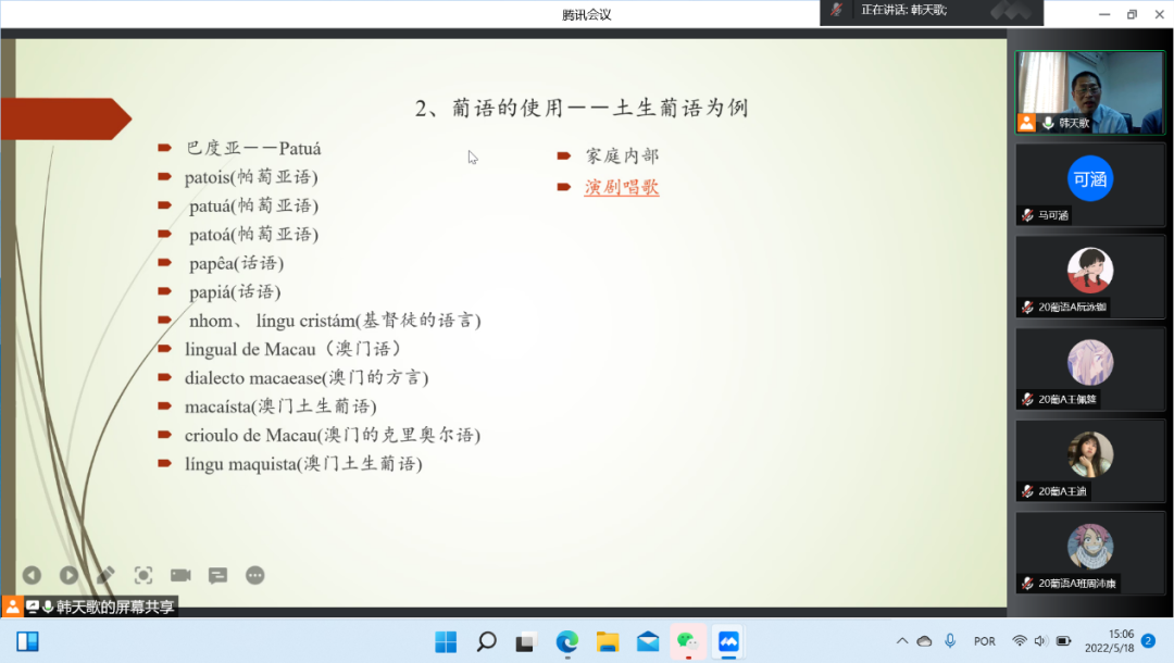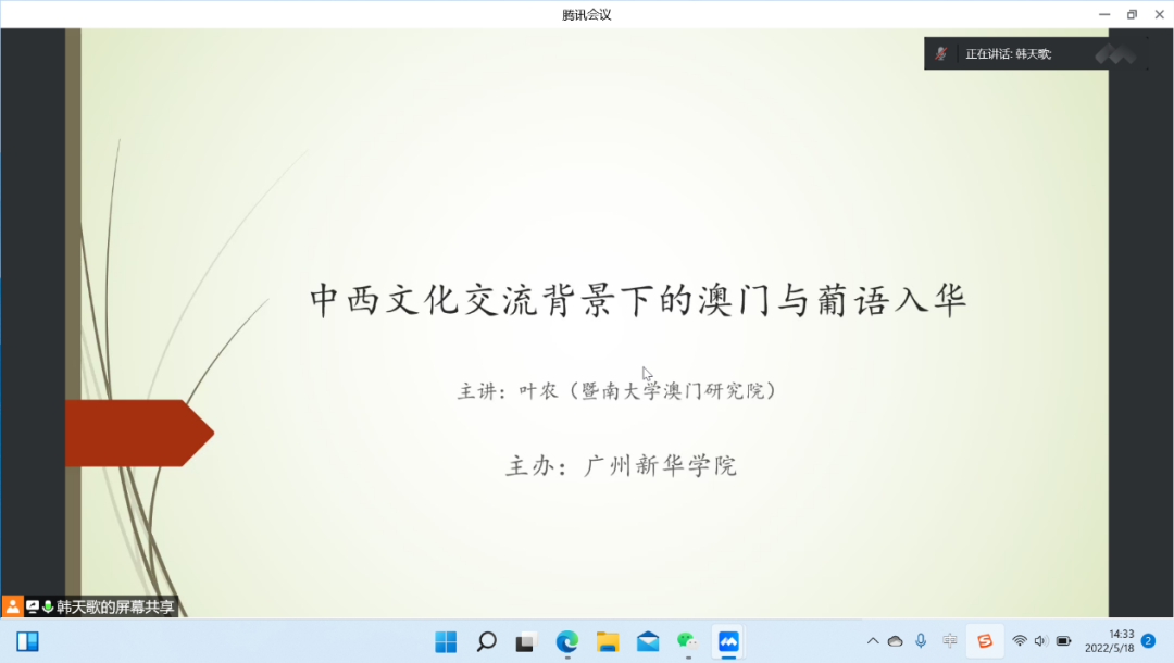 2022年5月18日下午,太阳成集团tyc邀请了叶农教授给同学们分享以《中西文化交流背景下的澳门与葡语入华》为主题的讲座。太阳成集团tyc葡萄牙语专业全体师生通过腾讯会议的形式参加了本次讲座。