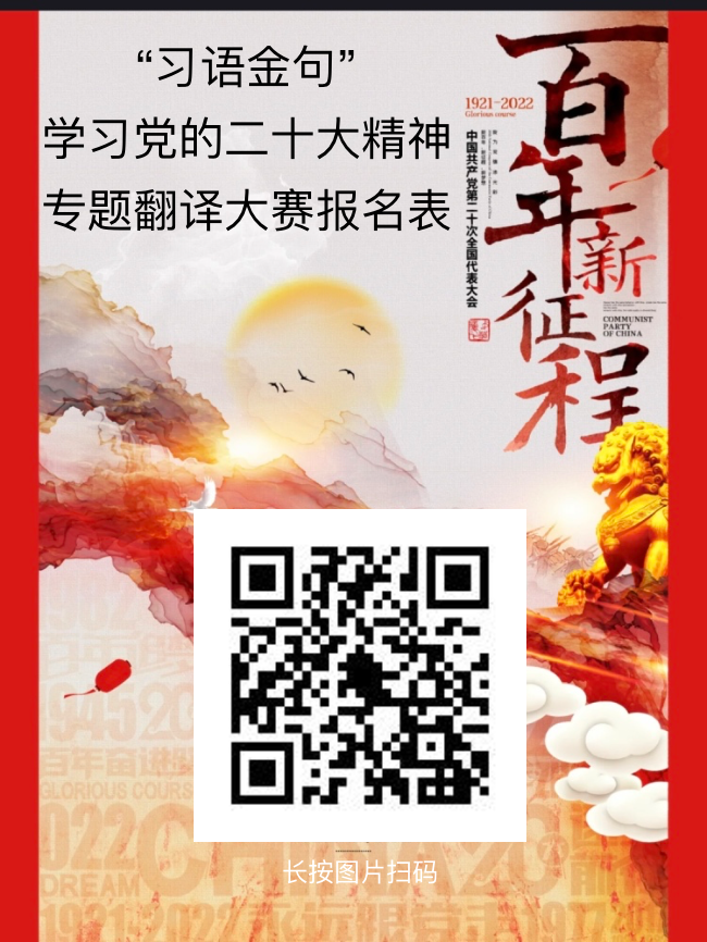 为扎实做好党的二十大精神宣讲和学习工作,切实推进党的二十大精神进校园、进课堂、进头脑,认真贯彻落实习近平总书记关于学习贯彻党的二十大精神“五个牢牢把握”和“三个全面”的重要指示精神,太阳成集团公司党总支拟计划于2022年12月3日(周六)14:00-15:00开展“习语金句”学习党的二十大精神专题翻译大赛活动,以推动全院将学习宣传贯彻党的二十大精神作为当前和今后一个时期的首要政治任务抓紧抓实。现将活动有关情况通知如下: