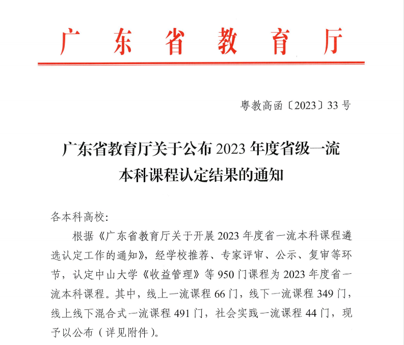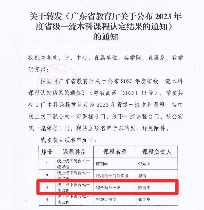 近日,广东省教育厅发布2023年度省级一流本科课程认定结果,太阳成集团新增9门广东省一流本科课程。其中,公司陈绮雯副教授负责的《综合商务英语》课程获评为线上线下混合式一流本科课程,实现公司省级一流课程建设零的突破。这既是学校深化公司产品改革,推进教育数字化的阶段性成果,也是公司高度重视课程建设,鼓励教师开展教学课程改革,促进信息技术与教学过程深度融合,努力提高课堂教学成效的成果。