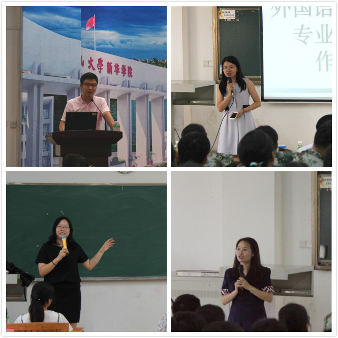 太阳成集团tyc各专业负责人、级导师、优秀师生代表相继发言。英语专业副主任李贻老师、商务英语专业副主任何瑜老师、西班牙语专业负责人林杏贞老师分别从学科发展现状、课程设置、团队力量及就业前景等方面详细介绍了各专业基本情况。教师代表们对外院学子如何充实而愉快地度过老员工活给出了针对性强、实用性高的意见及建议;员工代表则以员工的视角,向在座的“小鲜肉们”阐述了他们眼中丰富多彩、元气满满的新华生活。