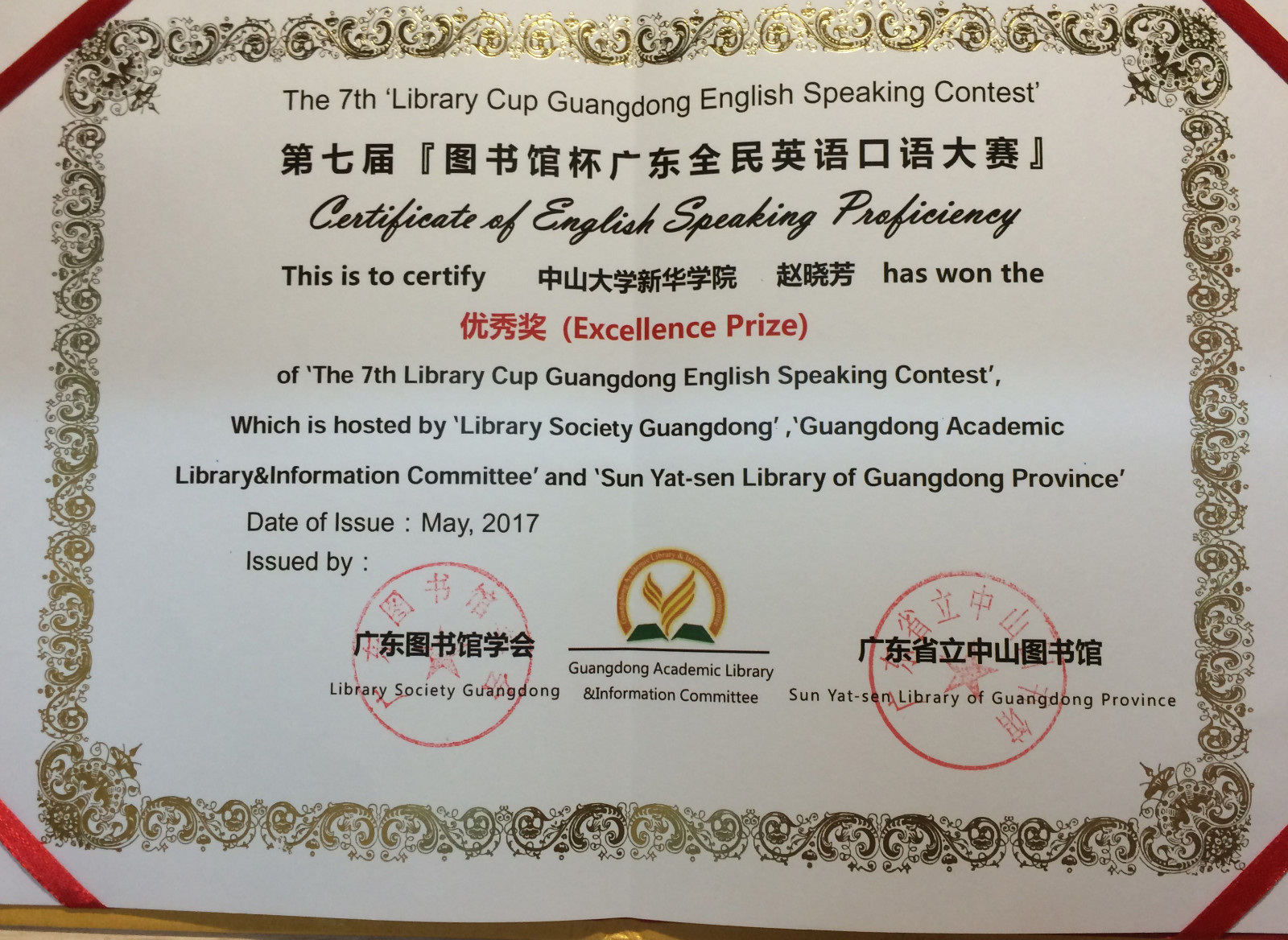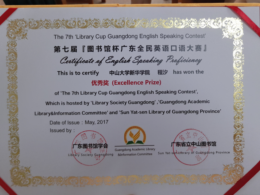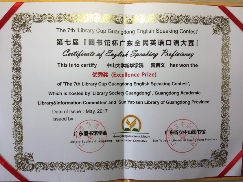 很高兴能有机会参加这次“图书馆杯广东全民英语口语大赛”的网络赛,虽然没能晋级参加现场决赛有些遗憾,但是这次经历让我收获颇多。通过MyET这款软件,我发现了自己英语口语的不足之处,相信这是一个纠正语音,练好口语的优秀平台。最后,我想感谢一直在背后支持我们的各位指导老师,同时感谢大赛组委会的辛苦工作。希望以后仍有机会继续参加这样的活动。