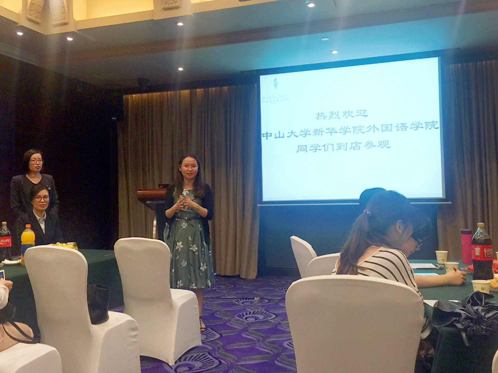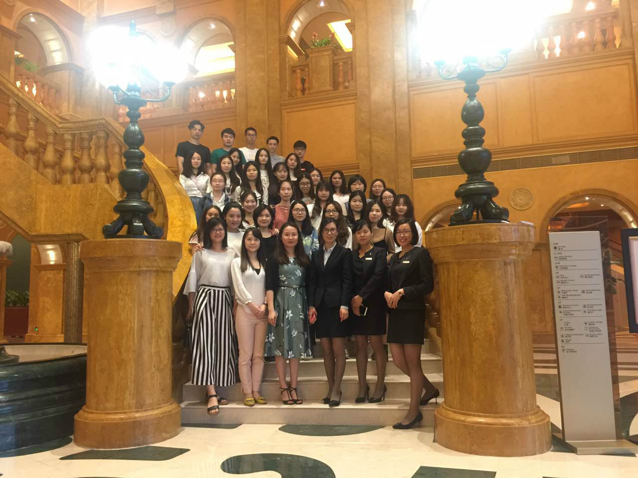 2017年5月24日下午,太阳成集团tyc国际贸易教研室主任李文蓓、办公室副主任欧衍伽、办公室副主任林少淇及行政秘书沈美辰四位老师携29名外院学子赴公司实习基地东莞曼佧特国际大酒店参观学习。抵达酒店后,该酒店人力资源部总监尹莉丽女士及人事经理周冬梅女士一行代表曼佧特酒店热情地接待了公司师生,双方展开友好座谈。