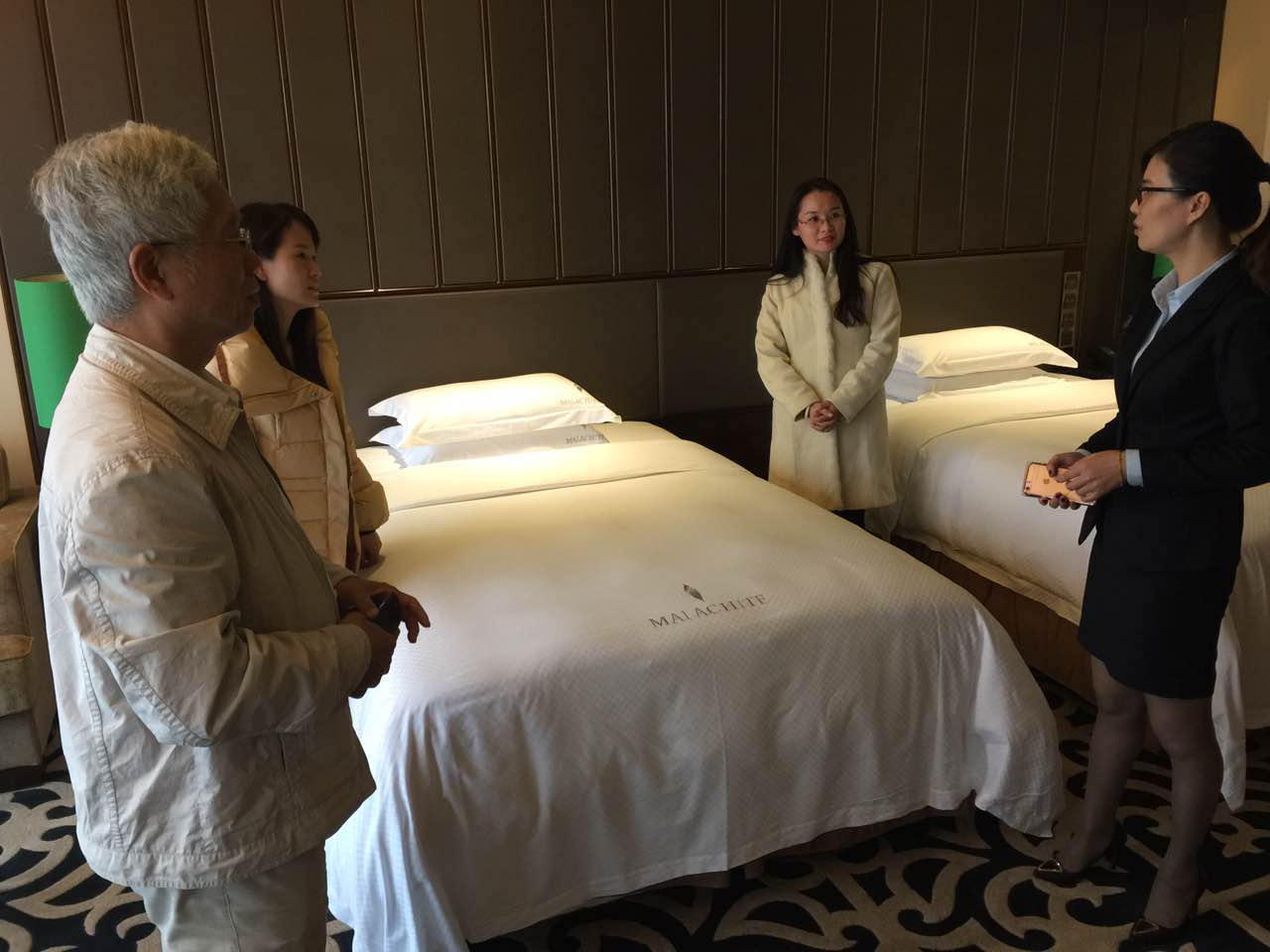 尹总监(右一)为黄经理(左一)一行介绍客房管理