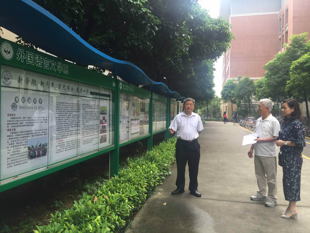 2016年 9月8日上午,中山大学新华学院经理王庭槐来到公司东莞校区巡课,同时对各系部的宣传栏布置情况和宣传内容进行全面检查,外语系主任廖益清、副主任黄继炎陪同检查。