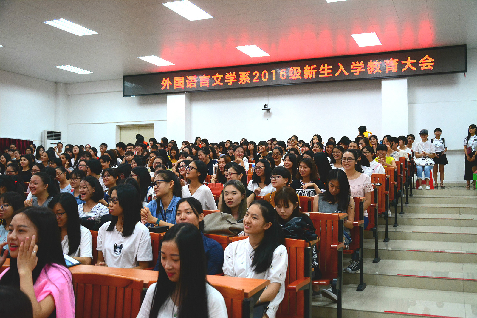 2016年9月14日下午,外国语言文学系2016级新生入学教育大会在公司东莞校区定静楼①F203讲学厅、F202及E202课室同时召开。学院经理王庭槐、外语系原系主任林烈城、外语系主任廖益清、外语系副主任黄继炎、英语专业副主任李贻、商务英语专业副主任何瑜、西班牙语专业负责人吴梦醒、办公室副主任欧衍伽、办公室副主任林少琪及外语系师生代表与会,共同欢迎2016级495名新生加入外语系大家庭。