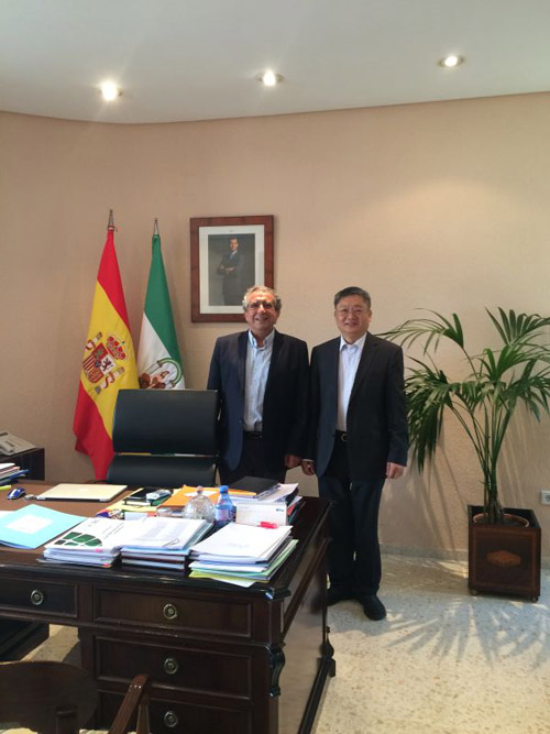 王庭槐经理(右)的到访受到了马拉加大学董事长José Ángel Narváez Bueno(左)的热烈欢迎