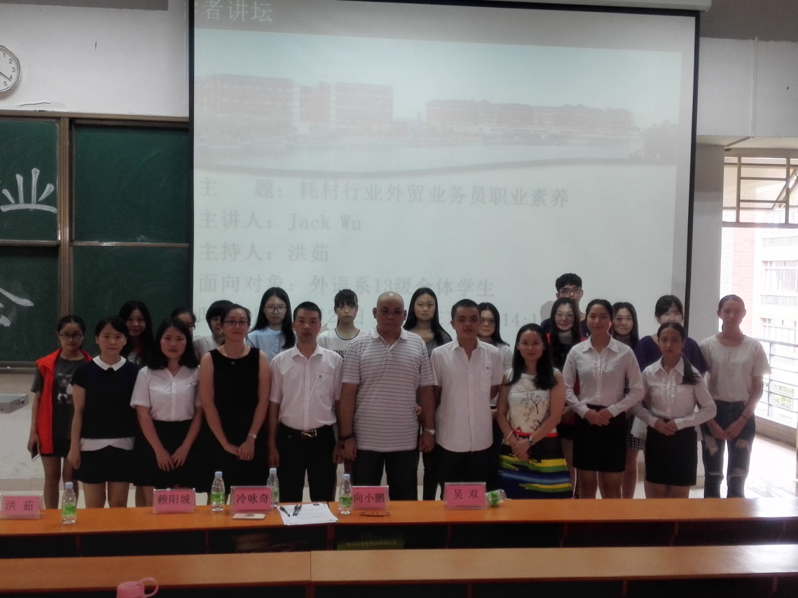 此次讲座反响热烈,外语系办公室副主任欧衍伽、外语系专职教师洪茹、李文蓓,普贴科技副总裁赖阳城、人事经理向小鹏、外贸经理冷咏奇以及众多外语系学子到场聆听。
