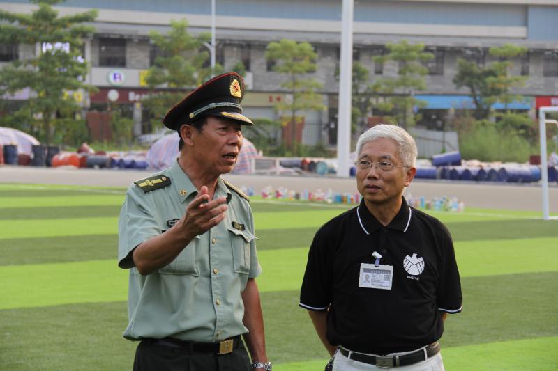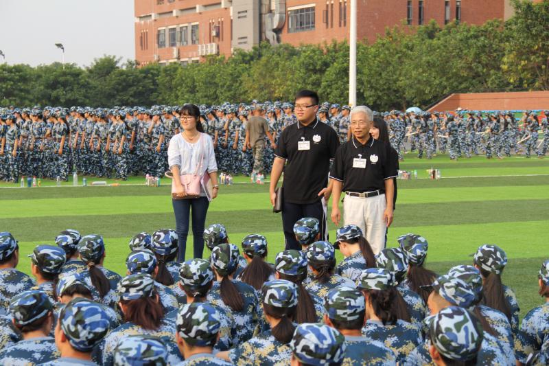 18号下午,外语系办公室主任黄继炎副教授顶着炎炎烈日到训练场上关心慰问新生。黄主任围绕着我系的训练方阵一一进行探望,关心询问新生们进来的起居饮食及训练情况,并鼓励同学们要继续坚持,好好配合教官的训练,培养坚强的意志,做好每一步。