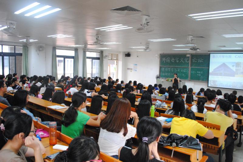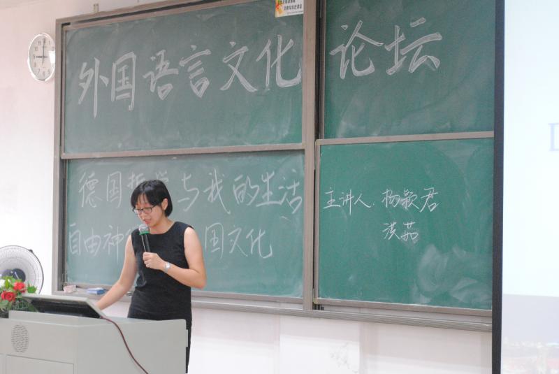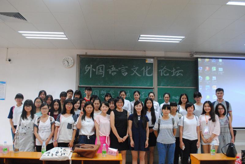2015年10月28日下午14:15,中山大学新华学院外国语言文学系外国语言文化论坛之第二讲“德国哲学与我的生活/自由神像下的美国种族文化大融合”在东莞校区教学楼②A601开讲。本次讲座由外国语言文学系教师洪茹、杨颖君担任主讲人。出席本次讲座的嘉宾有:外语系办公室副主任欧衍伽。