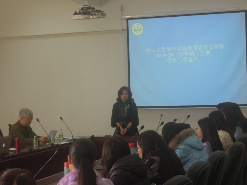 2015年1月14日下午,外国语言文学系在东莞校区实验楼2-A208召开2014学年第一学期工作总结会议。外语系系主任廖益清教授,系副主任李向奇副教授、黄继副教授、主任助理李贻老师,系办副主任欧衍伽老师、林少淇老师,及其他专职教师和辅导员共50名教职工参加了本次会议。本次会议由两部分组成,第一部分是系负责人对学系第一学期的各项工作的总体情况作总结并对第二学期主要工作作筹划;第二部分是教师备课组组长分别进行总结,分享教学方法和教学亮点和讲述下学期工作安排。